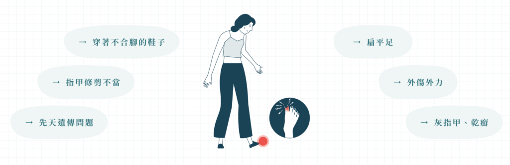 甲溝炎原因有很多,像是壓力、過往創傷,外傷或姆指外翻、細菌感染發炎、黴菌感染等,都有可能導致甲溝炎。
