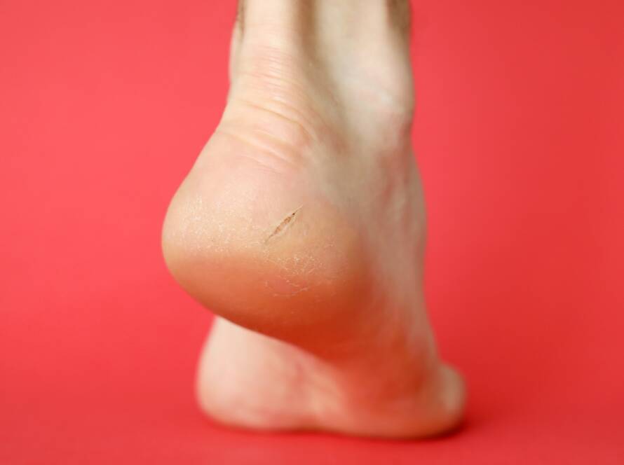 腳跟及足部邊緣龜裂,是角質層長期缺水、增厚、失去彈性後,受行走摩擦牽拉而出現的裂紋。