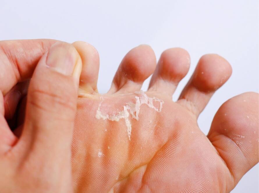 足部脫皮多見於腳掌、腳趾縫,常伴隨乾癢、脫屑,嚴重時皮膚泛紅、起水泡、脫屑脫落。